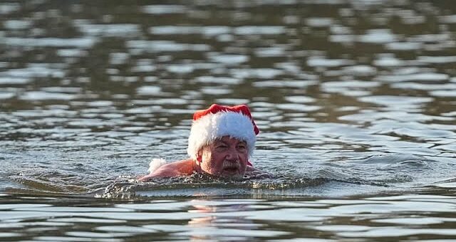 A Berlino, al lago Oranke, i temerari nuotatori invernali si sono ritrovati il giorno di Natale per una tradizione che unisce allegria e determinazione al freddo. Indossavano cappelli di Babbo Natale e costumi festivi, e hanno camminato insieme verso l’acqua mentre gli spettatori osservavano dalla riva ghiacciata.