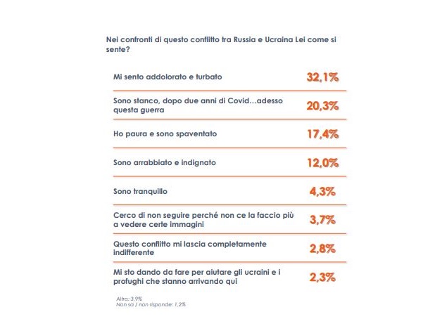 ROMA (ITALPRESS) – Il conflitto tra Russia e Ucraina, che si protrae ormai da oltre un mese, comincia ad avere dei risvolti anche da un punto di vista psicologico sulla popolazione italiana. Secondo un sondaggio di Euromedia Research, un terzo degli italiani, ad oggi, prova sentimenti di dolore e turbamento a causa della guerra in corso, soprattutto tra la popolazione più anziana. Uno su cinque, invece, si dichiara stanco per questi ultimi anni caratterizzati prima dalla pandemia e poi da questo conflitto. Quest’ultimo aspetto, poi, risulta ancora più accentuato tra i giovani che, a causa delle restrizioni e dei lockdown, si sono visti limitare e annullare le occasioni di socialità con i propri coetanei. Anche se il nostro Paese non è direttamente coinvolto, ad oggi, quasi un terzo degli italiani si sente comunque in guerra. Inoltre, per 2 italiani su 3, questo conflitto rischia di mettere in pericolo i confini europei così come li abbiamo conosciuti finora, una sensazione che prevale in particolare tra la popolazione over 65 anni, mentre è meno forte tra i giovani.