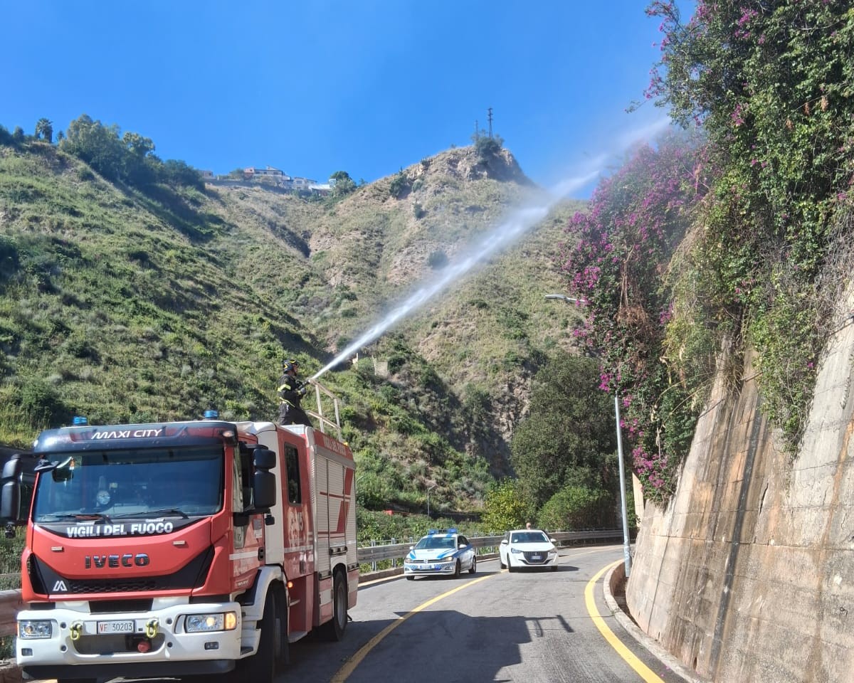 Il tempestivo intervento dei Vigili del Fuoco della Caserma di Letojanni è riuscito però a fermare l’ulteriore avanzata dell’incendio, che si era portato ormai, da monte a valle, a pochi metri dalla sede stradale. I VdF hanno così impedito alle fiamme di raggiungere l’arteria di Via Garipoli, salvaguardando l’area da conseguenze ancora più significative.