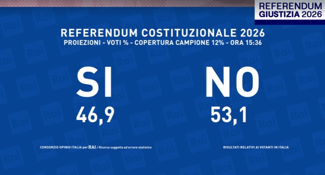 Secondo la prima proiezione di Opinio Rai (campione al 12%) sul referendum per la riforma della giustizia il No allunga al 53,1% e sarebbe avanti sul Sì, che si attesterebbe invece al 46,9%.