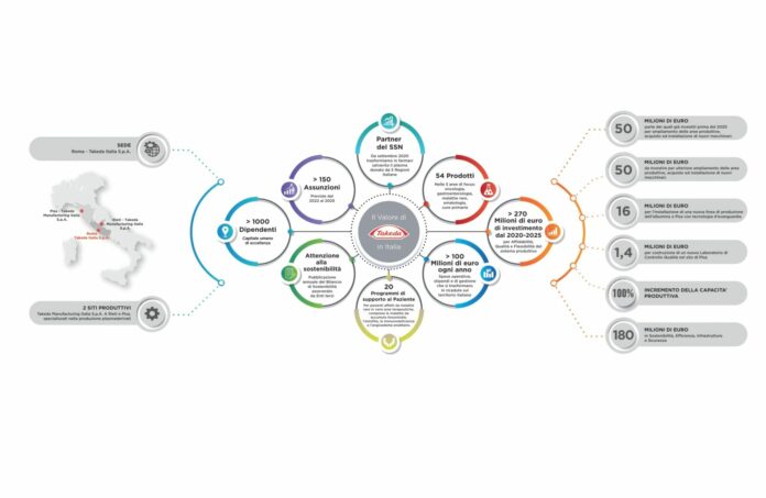 ROMA (ITALPRESS) – E’ stato presentato a Roma il nuovo piano di investimenti 2021-2025 di Takeda che riguarderà principalmente i due stabilimenti di Pisa e Rieti. Attiva da oltre 240 anni in più di 80 paesi, con circa 47.000 dipendenti nel mondo e oltre 1.100 in Italia, l’azienda biofarmaceutica globale ha deciso di consolidare ulteriormente la produzione di farmaci plasmaderivati, di cui detiene una quota di mercato significativa a livello mondiale. A Rieti lavorano, infatti, oltre 550 dipendenti impegnati nel frazionamento del plasma, dal quale si ricavano proteine fondamentali per il trattamento di patologie gravi nonchè rare. Mentre Pisa, attraverso il lavoro dei 200 collaboratori impiegati, è diventata il principale fornitore di albumina per Takeda nei paesi in via di sviluppo.