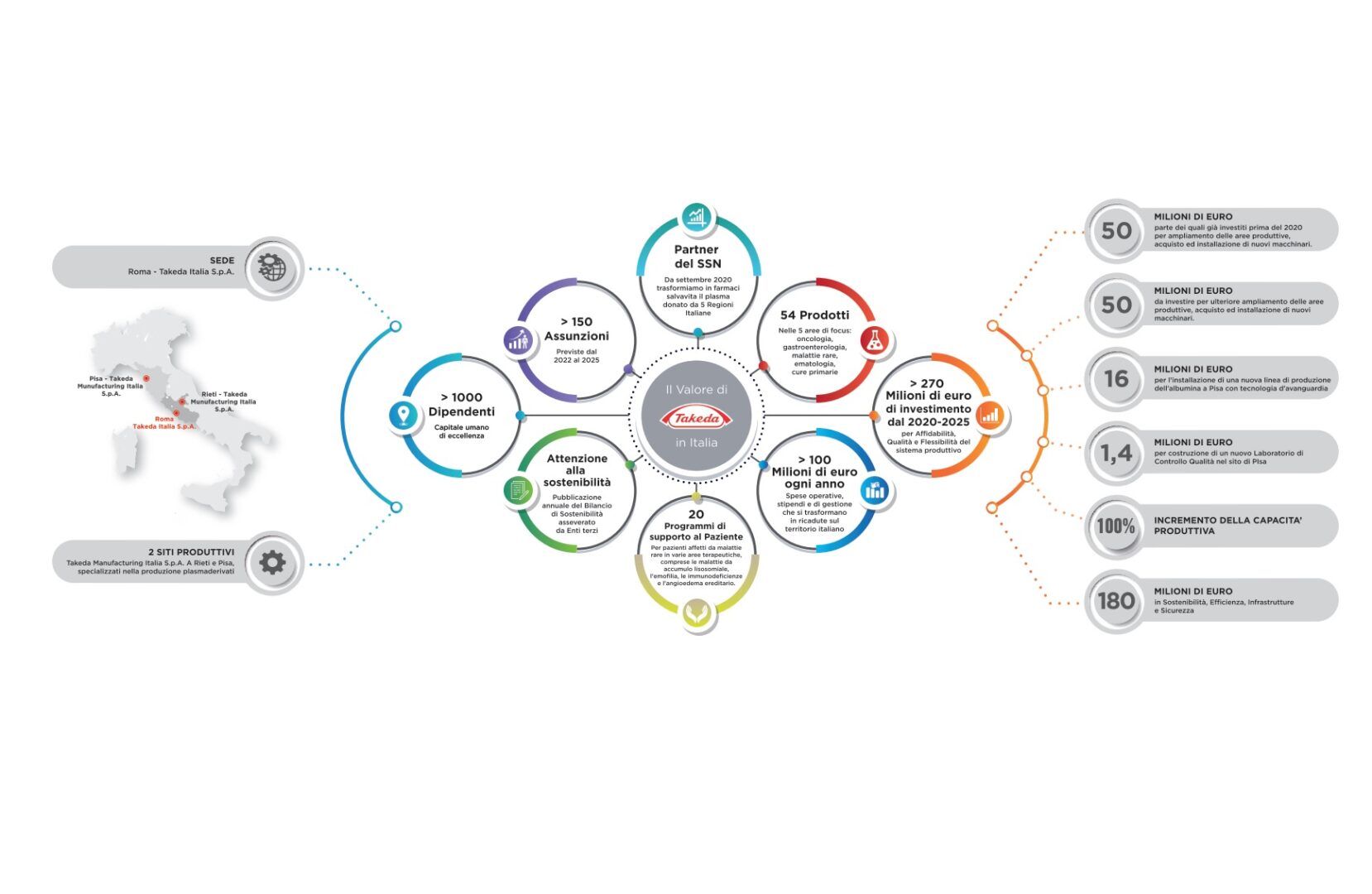 Durante l’evento Annarita Egidi, AD di Takeda Italia, ha voluto infine ricordare che “questi importanti investimenti economici volti all’aumento della capacità produttiva di farmaci plasmaderivati, porteranno con sè anche un incremento di risorse umane: un consistente piano di assunzioni, intorno alle 150 persone, che si uniranno agli oltre mille dipendenti di Takeda già presenti in Italia. Dipendenti che si inseriscono in un ambiente di lavoro inclusivo, sicuro, aperto e collaborativo, dove ciascun talento viene valorizzato e dove ogni dipendente può offrire il proprio contributo, lavorare e crescere come individuo. Grazie a questi valori e ad una cultura che si basa sul rispetto di diversità ed equità, con queste nuove assunzioni Takeda continuerà a perseguire l’obiettivo di garantire un equilibrio di genere nella totalità della popolazione aziendale che oggi vanta, tra leader e manager, il 47% di donne nella sede di Roma e il 36% presso gli stabilimenti di Rieti e di Pisa”.