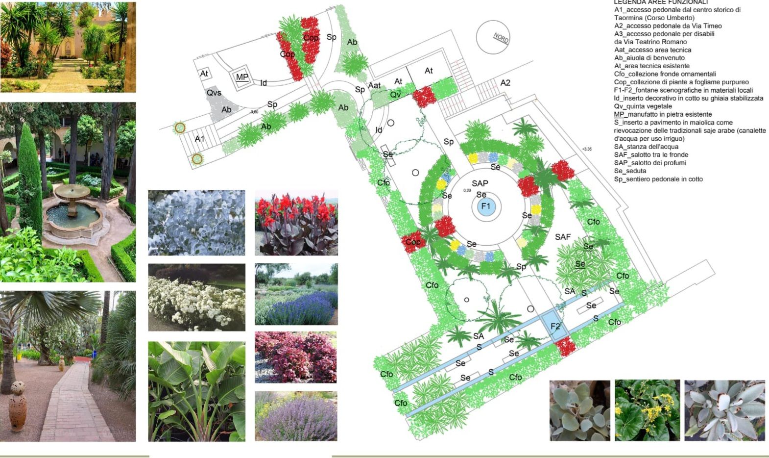 Si fa riferimento – nello specifico – a: “Vista: varietà di colori di fiori e fogliame; Olfatto: profumi di fiori e piante aromatiche; Tatto: possibilità di toccare specie vegetali dal fogliame vellutato o dalla consistenza carnosa; Gusto: assaggio dei frutti prodotti da alcune piante; Udito: suono rilassante dell’acqua proveniente dalle due fontane scenografiche previste dal progetto”.